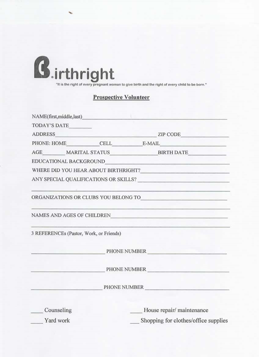 Birthright relies on the dedication, time and talents of volunteers. We welcome any and all individuals who share our philosophy and commitment to offer loving, confidential, nonjudgmental support to those who are pregnant or think they may be pregnant.